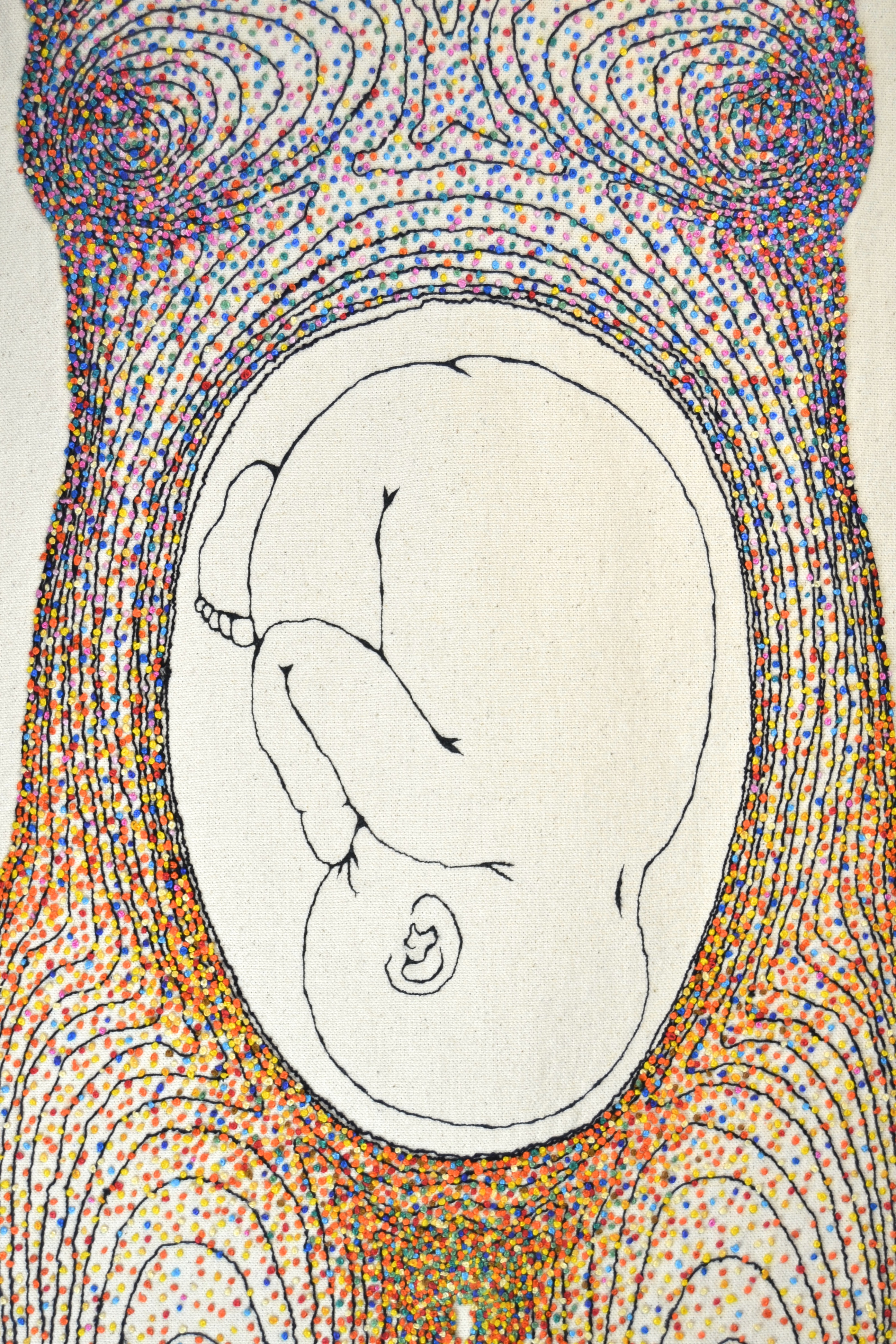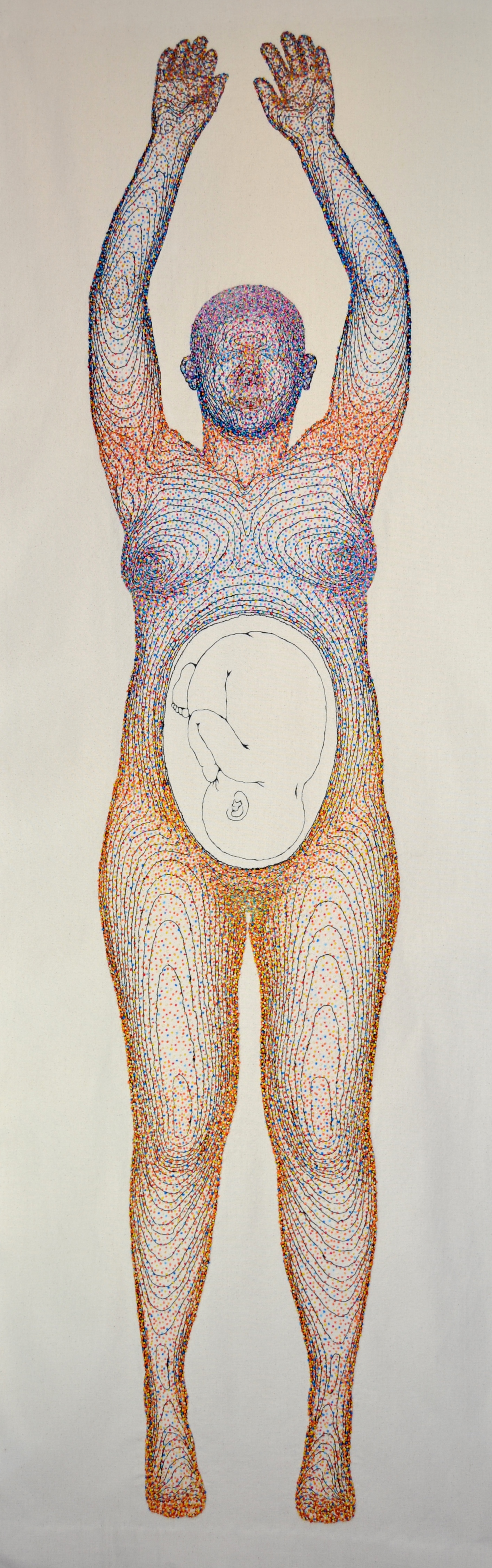 This piece took many months to create, starting first on the computer with MRI scans to assist in drawing the contour lines, this was printed as a template before stitching the lines using a sewing machine, before the final part of hand sewing the thousands of the hand stitched French knots. At this stage I toured the work to various public locations within Devon and Cornwall, UK sharing the process of sewing the piece and discussing the fascinating science behind the work.