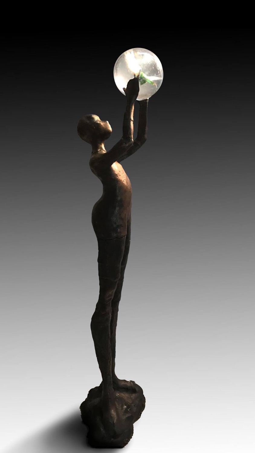 Especially in this time in our world, it is really important to support organizations that use art to make a difference. It is an underutilized resource that can change the world. For me, all of my inspiration comes from what I feel or what I see. For this award, it’s about art creating Peace in the world. I sculpt based on emotion, and ideas come to me as I move the sculpture around. Citizen of the World is a long-legged bronze figure reaching upwards holding a clear globe with an origami paper crane inside.” Lorri Acott